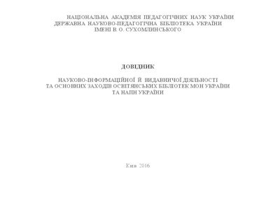 The handbook reveals the condition and summarizes the scientific information, publishing, teaching activities 48 leading educational libraries in the 2016. Handbook contains 1006 positions. Publishing to coordinate the functioning of the network of education libraries Ministry of education of Ukraine and National Academy of pedagogical Sciences of Ukraine, improve the quality of information services of pedagogical and scientific-pedagogical staff, improvement of professional activity of specialists of libraries in the educational sector of Ukraine. The Handbook is intended for librarians, methodologists of departments of education and science of the regional and city administrations, and other educators involved in the development of pedagogical science, education and practice.