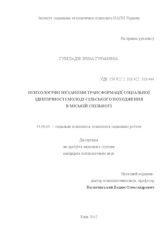 - Губеладзе, Ірина Гурамівна (orcid.org/0000-0001-8023-6408) (2012) Psychological Mechanisms of the Social Identity Transformation of Rural Youth in an Urban Community Doctoral thesis, Інститут соціальної та політичної психології.