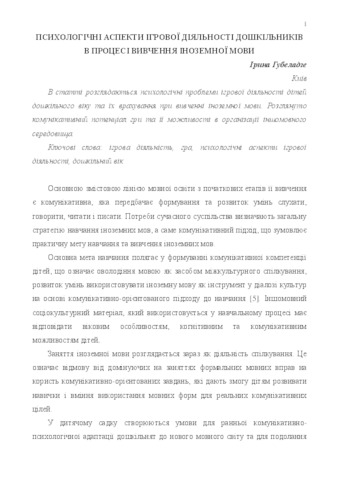 - Губеладзе, Ірина Гурамівна (orcid.org/0000-0001-8023-6408) (2012) Психологічні аспекти ігрової діяльності дошкільників у процесі вивчення іноземної мови Інститут розвитку дитини НПУ імені М.П. Драгоманова. pp. 1-13.