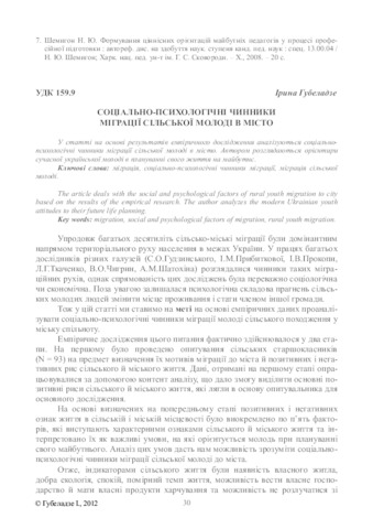 - Губеладзе, Ірина Гурамівна (orcid.org/0000-0001-8023-6408) (2012) Social and Psychological Factors of Rural Youth Migration to City Збірник наукових праць: філософія, соціологія, психологія, 1 (17). pp. 30-37.