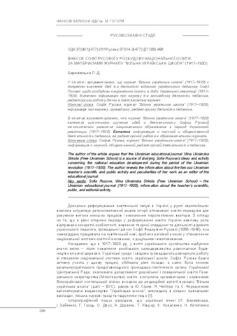 - Березівська, Лариса Дмитрівна (orcid.org/0000-0002-5068-5234) (2016) Sofia Rusova’s contribution to the development of the national education: according to the journal Vilna Ukrainska Shkola (1917–1920) Наукові записки НДУ ім. М. Гоголя, 1 (11). pp. 286-290.