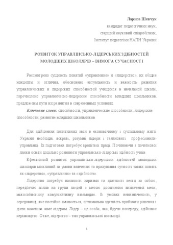 The essence of the notions «management» and «leadership», their common concepts and differences, the urgency and importance of developing managerial leadership skills of students in the primary school are revealed; managerial and leadership abilities of junior schoolchildren and the ways of their development in modern conditions are characterized.