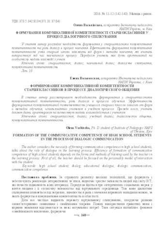 - Васьківська, Олена Євгеніївна (2016) Formation of the communicative competence of high school students in the process of dialogic communication Молодь і ринок, 11-12 (142-14). pp. 168-171. ISSN 2308-4634