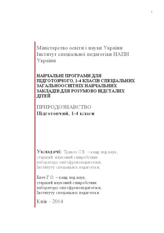 - Трикоз, С. В. (orcid.org/0000-0002-5929-589X) and Блеч, Г. О. (orcid.org/0000-0003-4884-6024) (2014) Educational program for preparatory, 1-4 grade special secondary schools for mentally retarded children. "Natural Science" (preparatory classes 1-4) [Teaching Resource]