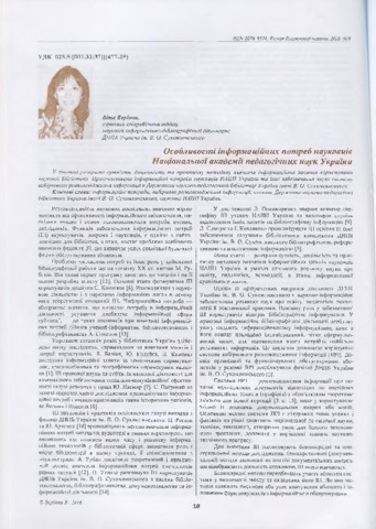 - Вербова, Віта Василівна (2016) Features information needs of scientists the National Academy of Pedagogical Sciences of Ukraine Вісник Книжкової палати, 9. pp. 18-20. ISSN 2076-9326