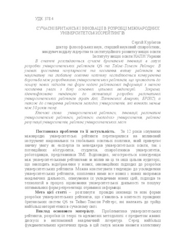 - Курбатов, Сергій (orcid.org/0000-0002-8929-7562) (2016) Contemporary British Innovations in the Development of International University Rankings Higher Education of Ukraine, 1 (60). pp. 65-73. ISSN 2078-1016