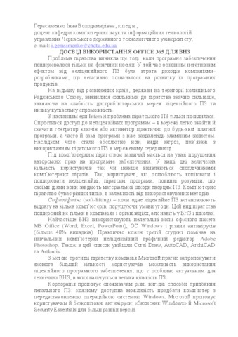 - Герасименко, І.В. (2016) Experience using Office 365 for Universities In: Матеріали науково - практичної Інтернет - конференції «Інформаційні технології в навчальному процесі 2016» , 1 . ЧОІППО імені К.Д. Ушинського, м. Чернігів, Україна, pp. 38-40.