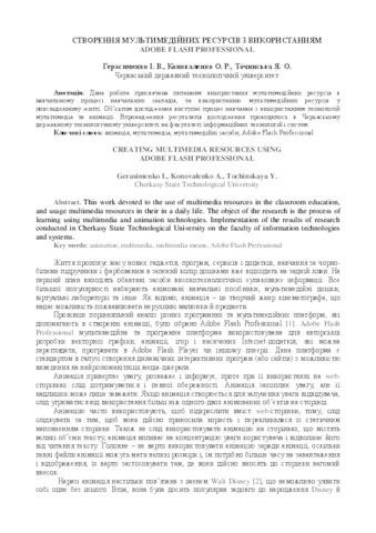 - Герасименко, І.В., Коноваленко, О. Р. and Точинська, Я. О. (2016) Creating multimedia resources using Adobe Flash Professional In: ІІІ Міжнародна науково-практична конференція "Інформаційні технології в освіті, науці і техніці" Інформаційно-комунікаційні технології в освіті . Маклаут, м. Черкаси, Україна, pp. 160-161.