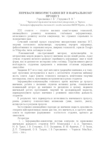 - Герасименко, І.В. and Глущенко, В.В. (2014) The advantages of using ICT in the classroom In: I Українська конференція молодих науковців «Інформаційні технології – 2014» Використання інформаційних технологій в освіті: сучасність та перспективи . Київський університет імені Бориса Грінченка, м. Київ, Україна, pp. 9-10.