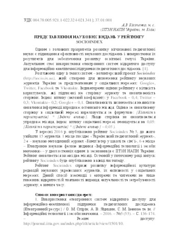 One of the main priorities of national pedagogy is to improve research and use its results for the development of the educational sector of Ukraine. Relevant is the use of electronic systems of open access to information and analytical support educational research. Consider one of these systems - a volunteer project Socioindex (http://socio.in.ua), which is designed to rank scientific journals of Ukraine for representation in social networks: Google+, Twitter, Facebook and Vkontakte.