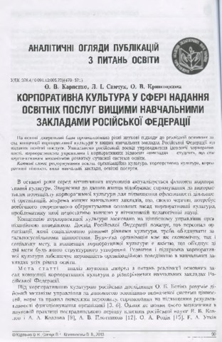 - Карпенко, О. В., Самчук, Л. І. and Кривоносова, О. В. (2013) Corporate Culture in the Sphere of Higher Education in Russian Federation Педагогіка і психологія. Вісник НАПН України (4). pp. 90-96. ISSN 2304-0629