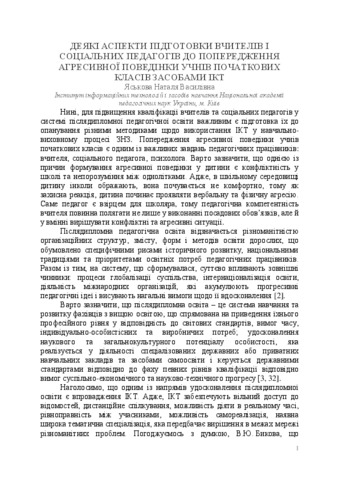 - Яськова, Н.В. (2016) Some aspects of training teachers and social workers to prevent aggressive behavior of primary school pupils with ICT In: Збірник тез ІІІ Української конференції молодих науковців. Секція 1. Використання інформаційних технологій в освіті: сучасність та перспективи . Київський університет імені Б.Грінченка, м. Київ, Україна, pp. 100-103.