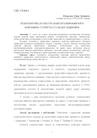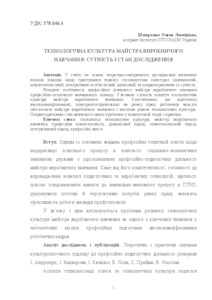 - Шамралюк, О.Л. (2016) Technological culture of master of production training: essence and status of investigations Теорія і методика професійної освіти. Електронне наукове фахове видання, 9 (1).
