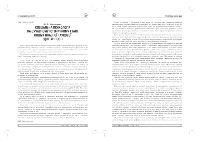 - Кобильченко, В.В. (orcid.org/0000-0002-7717-5090) (2016) Special psychology at a present historical stage: search of own scientific identity Педагогіка і психологія. Вісник НАПН України, 2 (91). pp. 64-70. ISSN 2304-0629