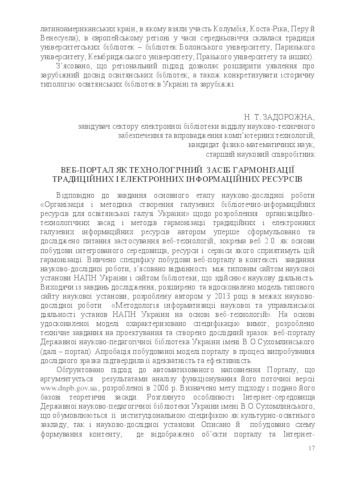 - Задорожна, Н.Т. (2016) Web portal as a technological means for harmonising traditional and electronic subject information resources In: Information support for pedagogical science and educational practice in Ukraine : scientific conference held by V.O. Sukhomlynskyi SSPL of Ukraine on 19 January 2016 in Kyiv : theses . Державна науково-педагогічна бібліотека України імені В. О. Сухомлинського, м. Київ, Україна, pp. 17-18.