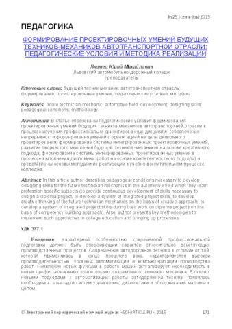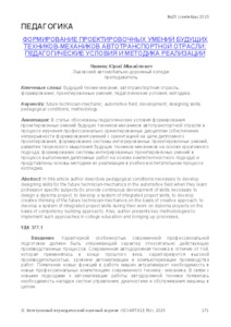 - Якімець, Юрій Михайлович (2015) Formation of designing skills of the future mechanic of the motor transport industry: pedagogical conditions and methods of realization SCI‐ARTICLE.RU, 25. pp. 171-178.