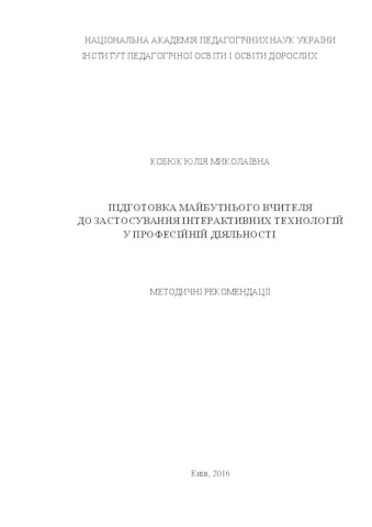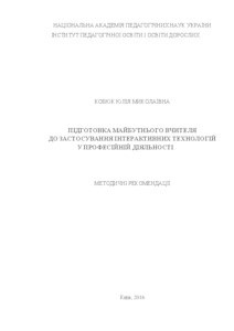 Guidelines described features interactive educational technology in school, proved the importance of preparing future teachers to use interactive technologies in professional activity, revealed organizational and pedagogical conditions aimed at providing such training, and provides recommendations for their use of interactive technologies in professional activity. Guidelines will be useful in the study and practice of high school teachers, students and educational institutions masters and postgraduate teacher education.