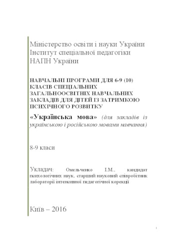 - Омельченко, Ірина Миколаївна (2016) Training programs for 6-9 grade special secondary schools for children with developmental delay "Ukrainian language". 8-9 classes [Teaching Resource]