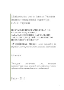 The content of the curriculum is structured in accordance with the requirements of the State Standard of complete secondary education and concluded on the basis of the adaptation of state requirements for general education students with mental retardation. The implementation of a training program on the Ukrainian language will ensure empowerment of language, speech and communicative competences in students 8-9 grades of developmental delay by introducing an updated course content with the "Ukrainian language". For teachers who teach children 8-9 grade special secondary schools for children with developmental delay.