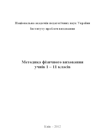 Зубалій, М.Д., Волков, Л.В., Жевага, С.І., Івашковський, В.В., Остапенко, О.І. (orcid.org/0000-0001-5343-0088), Тимчик, М.В., Ільченко, А.І., Мудрік, В.І., Мудрік, І.В., Столітенко, Є.В. and Шинкарюк, А.І. (2012) Methods of physical education pupils 1 – 11 classes . Педагогічна думка, м. Київ, Україна. ISBN 978-966-644-232-4