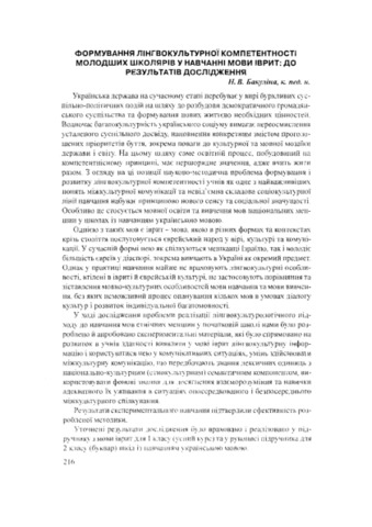Abstracts containing results of research on the study. Tested under scientific reporting konfrentsiyi Institute of Education NAPS of Ukraine. In abstracts the notion linguo-cultural competence as one of the most important concepts in the field of intercultural communication and socio-cultural component of language teaching line content; Updated results naukvoho research and accounted for designing textbooks for Hebrew classes 1 and 2.