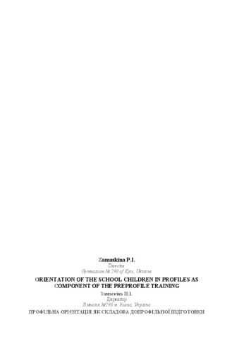 Additional Information: Бібліографічний опис: Замаскіна П.І. Профільна орієнтація як складова допрофільної підготовки [Електронний ресурс] / П.І. Замаскіна // Trends in the development of national and world science: Collection of scientific articles. - Verlag SWG imex GmbH, Nürnberg, Deutschland, 2016. – S. 293–297.