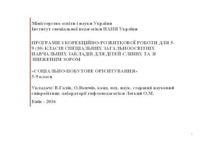 - Легкий, О.М. (orcid.org/0000-0001-8934-7390), Галів, В.В. and Якимів, О.І. (2016) Programmes of remedial-developing work for 5-9(10) classes special secondary schools for blind and children with visual impairments: "Social - household orientation" 5-9 classes [Teaching Resource]