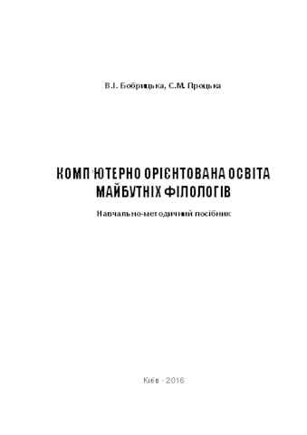 Бобрицька, Валентина Іванівна and Процька, Світлана Миколаївна (2016) Computer oriented education of future philologists . Скайтек, м. Полтава, Україна. ISBN 978-966-7723-83-5