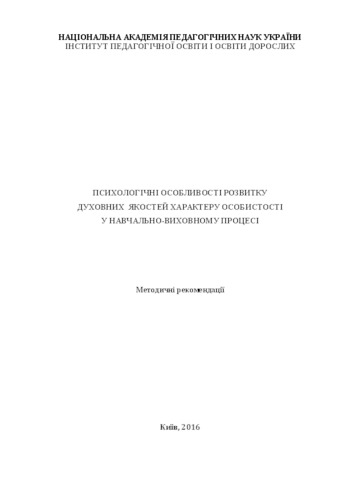 Guidelines "Psychological conditions of development of spiritual qualities of personal character bystosti in the educational process "dedicated to psychological conditions characterized optimization terolohichnoho personality development and presentation of psychological training "spiritual development character traits in teachers and students. " Innovative training aimed at harmonizing nature and spiritual development qualities of modern teachers and high school students by forming moral attitudes, in- Thinking positively, gaining skills for moral behavior. Special course combines these forms psychological work as lectures, discussions, psycho, role-playing games. Guidelines designed for psychologists and teachers to work with pupils and stuDent university psycho-pedagogical profile.