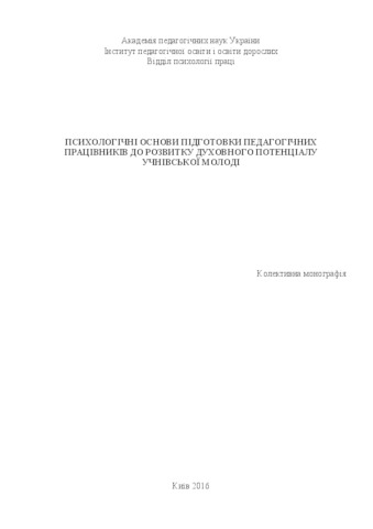 The book presents the results: synthesis developed approaches to solving problems; development psychodiagnostic tools and learning-readiness studies and psychological foundations of teacher staff in the development of the spiritual potential of youth. Actuality monographs determined to explore the psychological foundations of creativity and improve the pedagogical skills of teachers, which ultimately has a psychological preconditions for the development of the spiritual potential of youth.