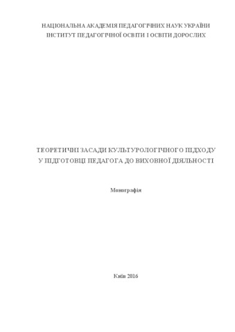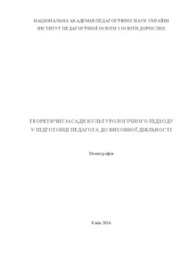 In the monograph grounded theory of cultural approach to teacher training in educational activities, including: analyzed the general scientific methodology in preparing strategies future teachers to educational activity; proved that cultural approach is a scientific basis for the formation and development professional competence of future teachers; proved that Civic education - the leading direction of the organization, educational content process in higher educational institutions; identified conceptual framework and technological component of innovation educational activity of the future teacher on the basis of cultural approach. The monograph can be useful for scientific and teaching staff, exploring issues of teacher training to educational activities.
