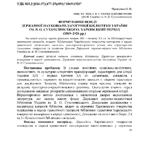 - Орищенко, Ірина Олександрівна (2016) Fund formation of V. О. Suhomlynskyi State Scientific and Pedagogical Library of Ukraine: bCharkiv period (1869-1926) Наукові праці Державної науково-педагогічної бібліотеки України імені В. О. Сухомлинського. Вип. 5. Організація і методика створення корпоративних інформаційних ресурсів для освітянської галузі України. pp. 83-90. ISSN 2409-0891