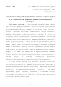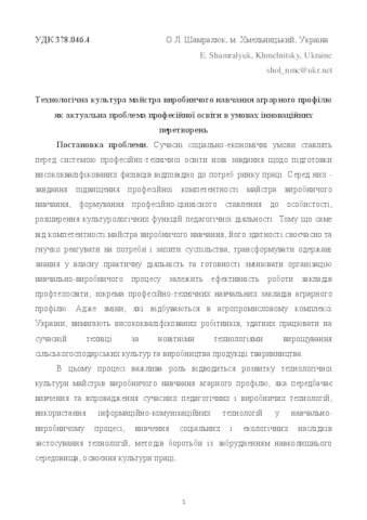 - Шамралюк, О.Л. (2016) Technological culture of master of production training agrarian profile as the actual problem of vocational training in terms of innovation Сучасні інформаційні технології та інноваційні методики навчання у підготовці фахівців: методологія, теорія, досвід, проблеми, 45. ISSN 2412-1142