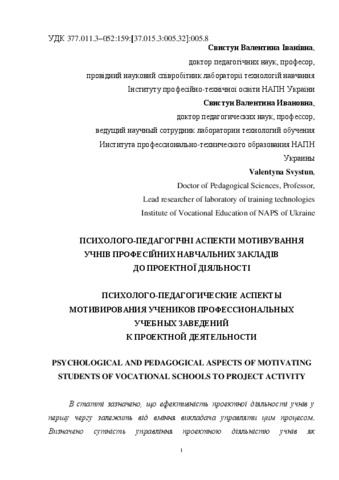 - Свистун, Валентина Іванівна (2016) Psychological and pedagogical aspects of motivating students of vocational schools to project activity Теорія і методика професійної освіти, 3 (11).