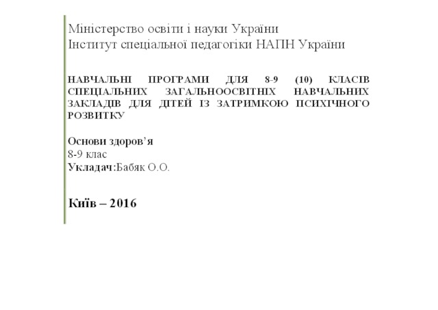 - Бабяк, О.О. (2016) Training programs for 8-9 (10) special secondary schools for children with mental retardation. "Health Basics" class 8-9 [Teaching Resource]