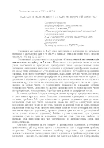 - Онопрієнко, Оксана Володимирівна and Скворцова, С.О. (2015) Learning mathematics in Grade 4: Methodological comments Початкова школа (7-8). ISSN 0131-5358