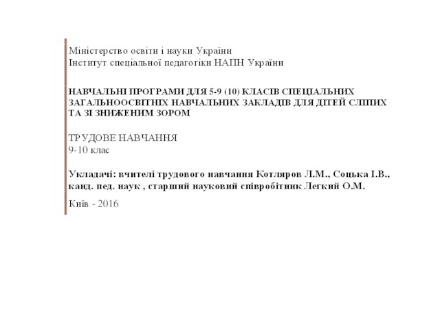 - Легкий, О.М., Котляров, Л.М. and Соцька, І.В. (2015) Educational programs for 5-9 (10) classes special secondary schools for blind and children with visual impairments. Labour education 9-10 classes [Teaching Resource]