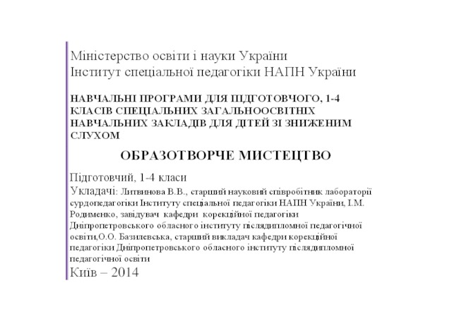 - Литвинова, В.В., Родименко, І.М. and Базилевська, О.О. (2014) Educational programs for preparatory, 1-4 classes of special general educational institutions for children with reduced hearing. Fine Arts Preparatory, Grades 1-4 [Teaching Resource]