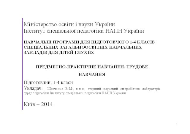 - Шевченко, В.М. (orcid.org/0000-0003-0119-3206) (2014) Curriculum for preparatory, 1-4 grades of special general educational institutions for children of deaf people. Subject-practical training, Labor training preparatory, 1-4 grades [Teaching Resource]