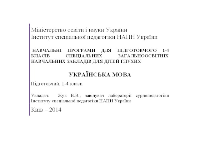 - Жук, В.В. (orcid.org/0000-0001-8183-5250) (2014) Curriculum for preparatory 1-4 grades of special general educational institutions for deaf children. Ukrainian language. Preparatory, grades 1-4 [Teaching Resource]