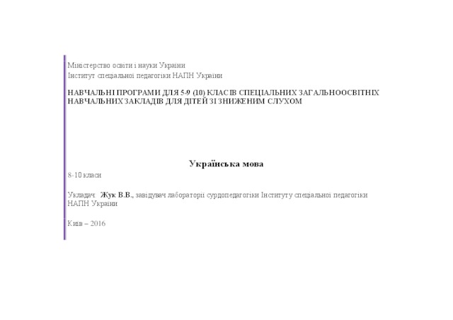 - Жук, В.В. (orcid.org/0000-0001-8183-5250) (2016) Educational programs for 5-9 (10) classes of special secondary schools for hearing impaired children. Ukrainian language. 8-10 classes [Teaching Resource]