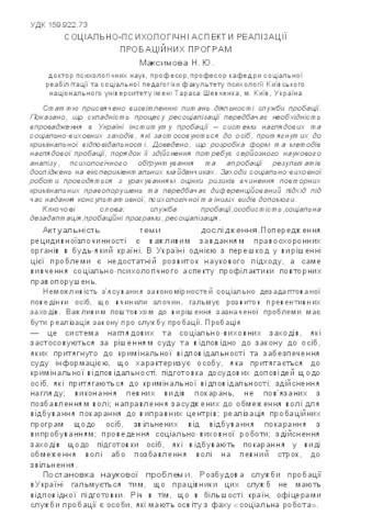 - Максимова, Н.Ю. (2016) Socio-psychological aspects implementation of the programmes probation. Актуальні проблеми психології: зб. наук. праць Інституту психології імені Г. С. Костюка НАПН України. Том. ХІ: Психологія особистості. Психологічна допомога особистості, 14. pp. 61-69. ISSN 2072-4772