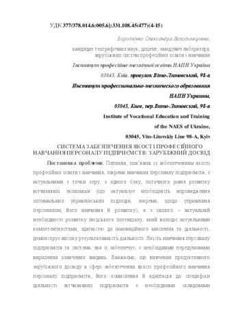 - Бородієнко, О.В. (2016) The quality assurance system of professional training in companies: foreign experience Професійна освіта: проблеми та перспективи, 11. pp. 120-125. ISSN 2411-6238