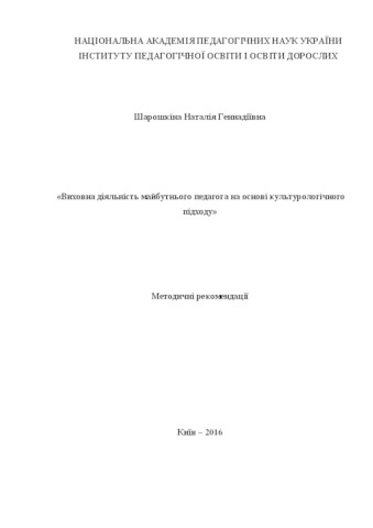 In the guidelines the theoretical analysis of the problem of "Psycho-pedagogical justification forms of training future teachers to educational action on the basis of cultural approach." The characteristic features cultural forms of training future teachers to educational activities. Grounded psychological and pedagogical aspects of teacher training in the form of cultural approach to the profession. The analysis of the literature on pedagogy, which reveals the peculiarities of educational work with children, the classification of forms of training future teachers to educational action. For teaching staff of secondary and vocational schools.