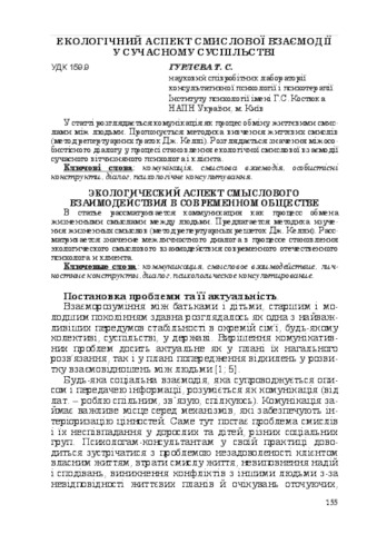 - Гурлєва, Т.С. (orcid.org/0000-0002-6518-5216) (2014) The ecological aspect of semantic interaction in contemporary society Актуальні проблеми психології. Збірник наукових праць Інституту психології імені Г.С. Костюка НАПН України. - Том VII. Екологічна психологія. (36). pp. 155-161. ISSN 2072-4772