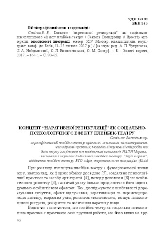 - Савінов, Володимир Вікторович (orcid.org/0000-0001-5830-2333) (2017) The concept of "narrative reticulation" as a Playback Theatrical socio-psychological effect In: ХІV Міжнародна міждисциплінарна наук.-практ. конф. "Простір арт-терапії: можливості інтеграції", 23–25 лютого 2017 р., м. Київ, Україна.