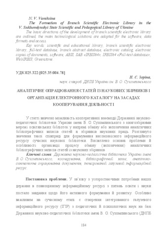 Keywords: the V. Sukhomlynskyi State Scientific and Pedagogical Library of Ukraine, cooperation, bibliographic record, analytical and synthetical processing of documents, scientific collected books, integrated branch informational resource.