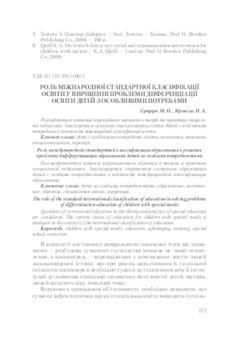 - Супрун, М.О. (orcid.org/0000-0002-4198-9527) and Ярмола, Н. А. (orcid.org/0000-0001-9374-5543) (2013) The role of the standard international classification of education in solving problems of differentiation education of children with special needs Освіта осіб з особливими потребами: шляхи розбудови, 1 (4). pp. 173-180. ISSN 978-966-189-232-2