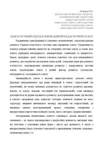 - Огієнко, О.І. (2016) Andragogical approach in innovative teacher education In: Інноваційний розвиток вищої освіти: глобальний та національний виміри змін , 1 . СумДПУ імені А.С. Макаренка, м. Суми, Україна, pp. 17-20.