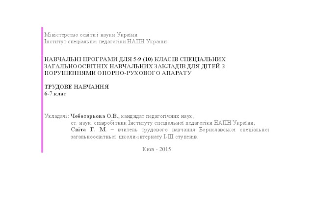 - Чеботарьова, О. В. (orcid.org/0000-0002-4560-3708) and Світа, Г. М. (2015) Educational programs for 5-9 (10) special classes of secondary schools for children with disorders of the musculoskeletal system. "Technical education" 6-7 grade [Teaching Resource]